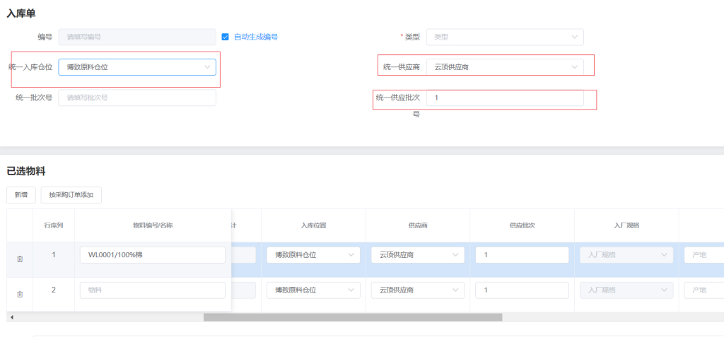 6.如出现多行物料都是由同一供应商(入库位置、供应批次号)可点击统一供应商(入库位置、供应批次号)则不需要在一个一个添加供应商(入库位置、供应批次号)