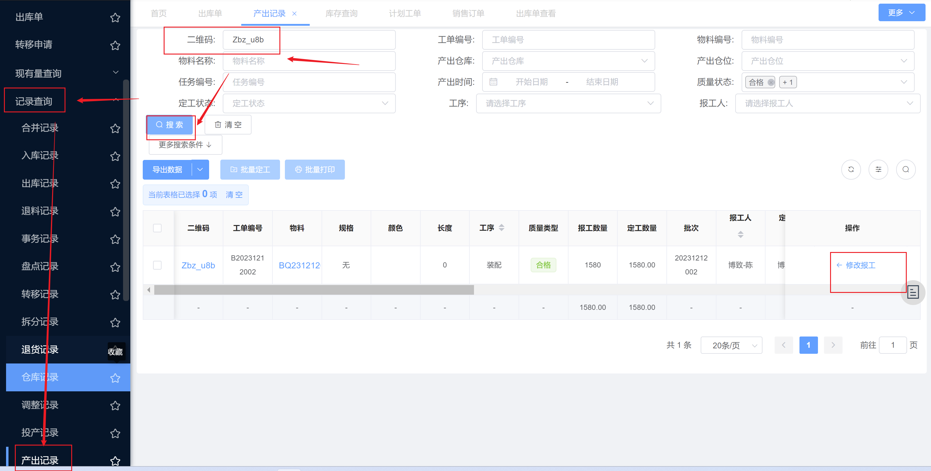 3、在【仓库管理-记录产出-产出记录】按照二维码搜索出该物料,在点击修改定工,调整为正确的生产数量。